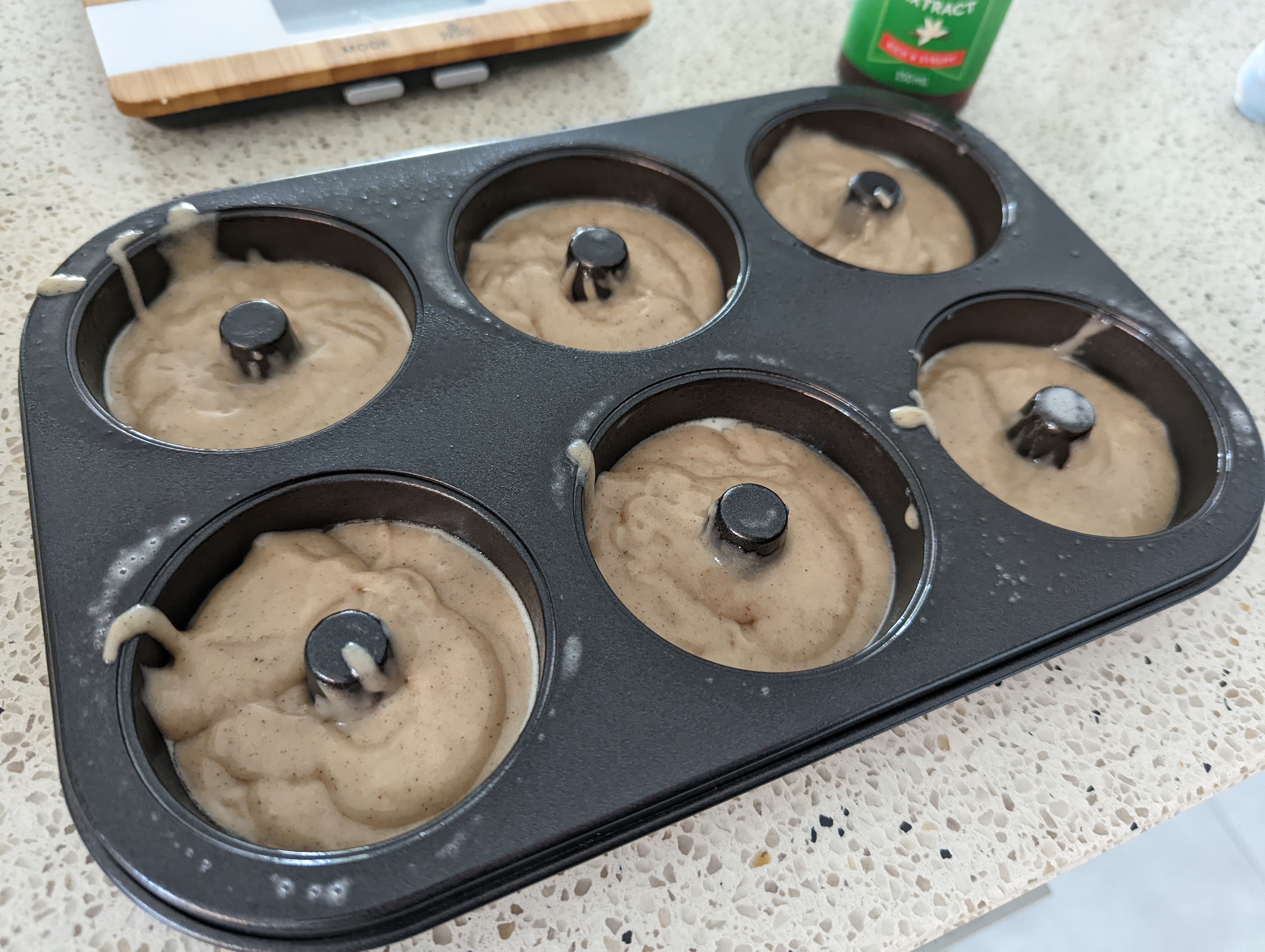- Spoon the filling into the donut pan, filling each one half-way, as they will rise a lot in the oven.